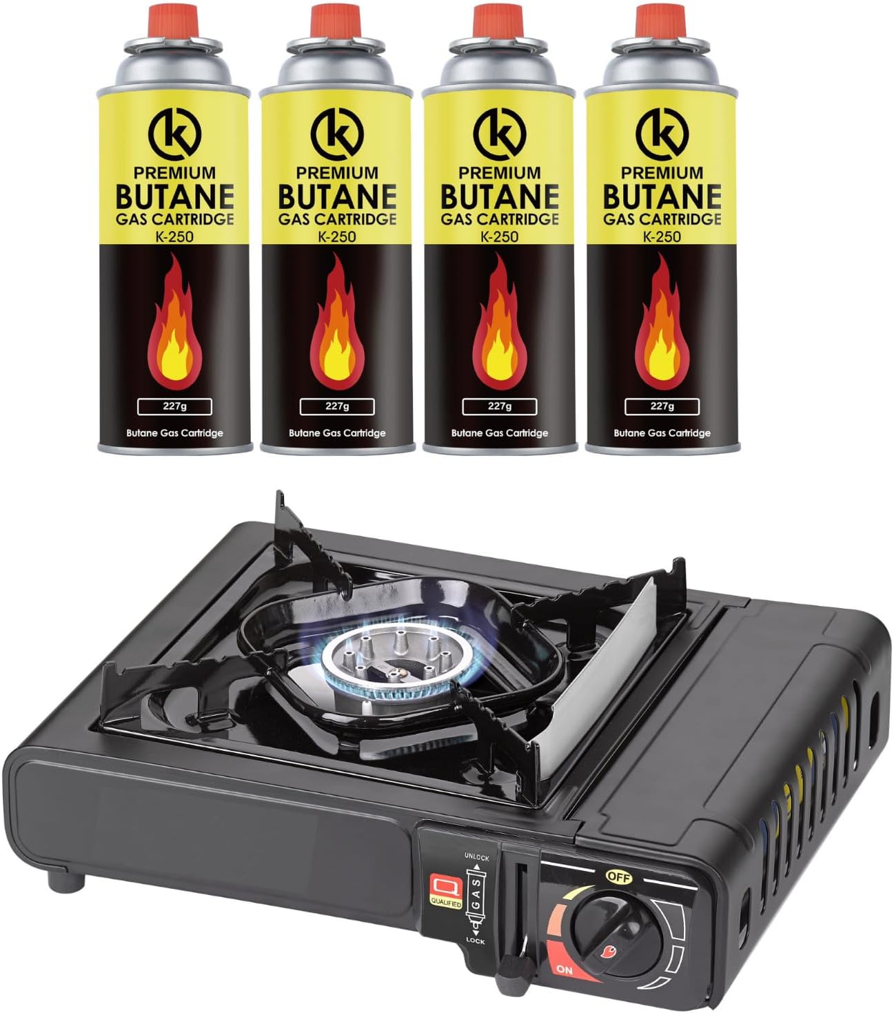 KROWN – Cocina Portatil de Gas Butano 227g, 4 Cartuchos K-250 de Gas Incluidos para Camping, Bombonas K-250